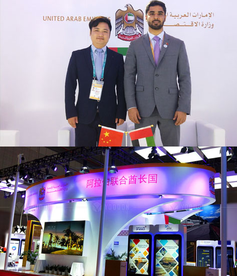 阿聯(lián)酋館的展臺設(shè)計和建造吸引眼球,引人注目,創(chuàng)意理念來自于阿聯(lián)酋國徽中鷹的元素,頂部更是使用了大量的LED變色燈烘托整個展臺的氛圍。
