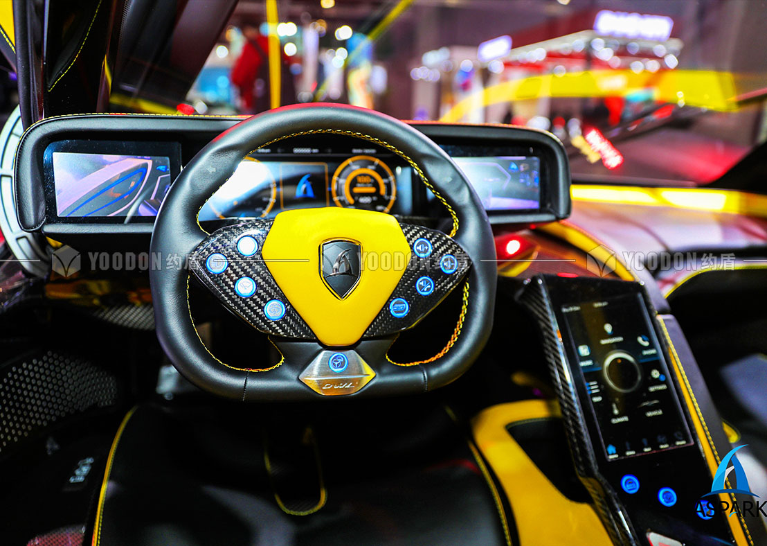 展臺設計思路皆尊崇速度感與獨特感,整體造型設計跳出常規邏輯,使人耳目一新,傾斜的異形吊頂仿佛是受到跑車高速行進的風速影響,在靜止的空間內帶來極致的動態感受,與展品的特性、造型等達到各方面的契合。